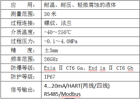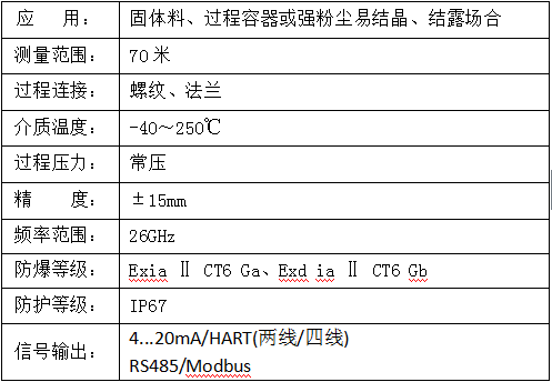 HHRD系列傳感器是26G高頻雷達式物位測量儀表,輸出4-20mA模擬信號,測量******距離可達70米。 天線被進一步優(yōu)化處理,新型的快速的微處理器可以進行更高速率的信號分析處理,使得儀表可以用于:反應釜或固體料倉非常復雜的測量條件。