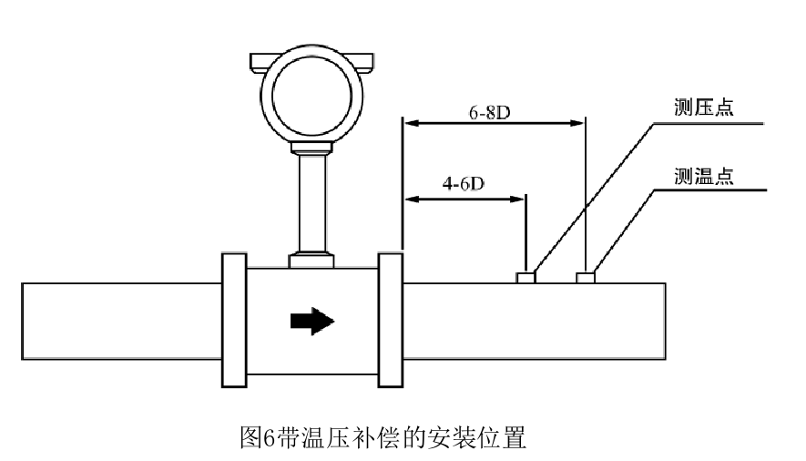 電氣安裝應(yīng)注意傳感器與轉(zhuǎn)換器之前采用屏蔽電纜或低噪聲電纜連接,其距離不應(yīng) 超過(guò)使用說(shuō)明書(shū)的規(guī)定。布線(xiàn)時(shí)應(yīng)遠(yuǎn)離強(qiáng)功率電源線(xiàn),盡量用單獨(dú)金屬套管保護(hù)。應(yīng)遵 循“一點(diǎn)接地”原則,接地電阻應(yīng)小于10Ω。整體型和分離型都應(yīng)在傳感器側(cè)接地,轉(zhuǎn) 換器外殼接地點(diǎn)應(yīng)與傳感器“同地”。帶溫壓補(bǔ)償時(shí)安裝位置,如圖6所示。