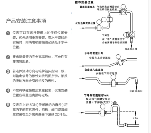 1.系統(tǒng)正常運(yùn)行時(shí)測(cè)量管必須保證滿(mǎn)管,如出現(xiàn)非滿(mǎn)管,流量計(jì)就不能正常工作,讀數(shù)可能是忽大忽小的隨機(jī)數(shù)。